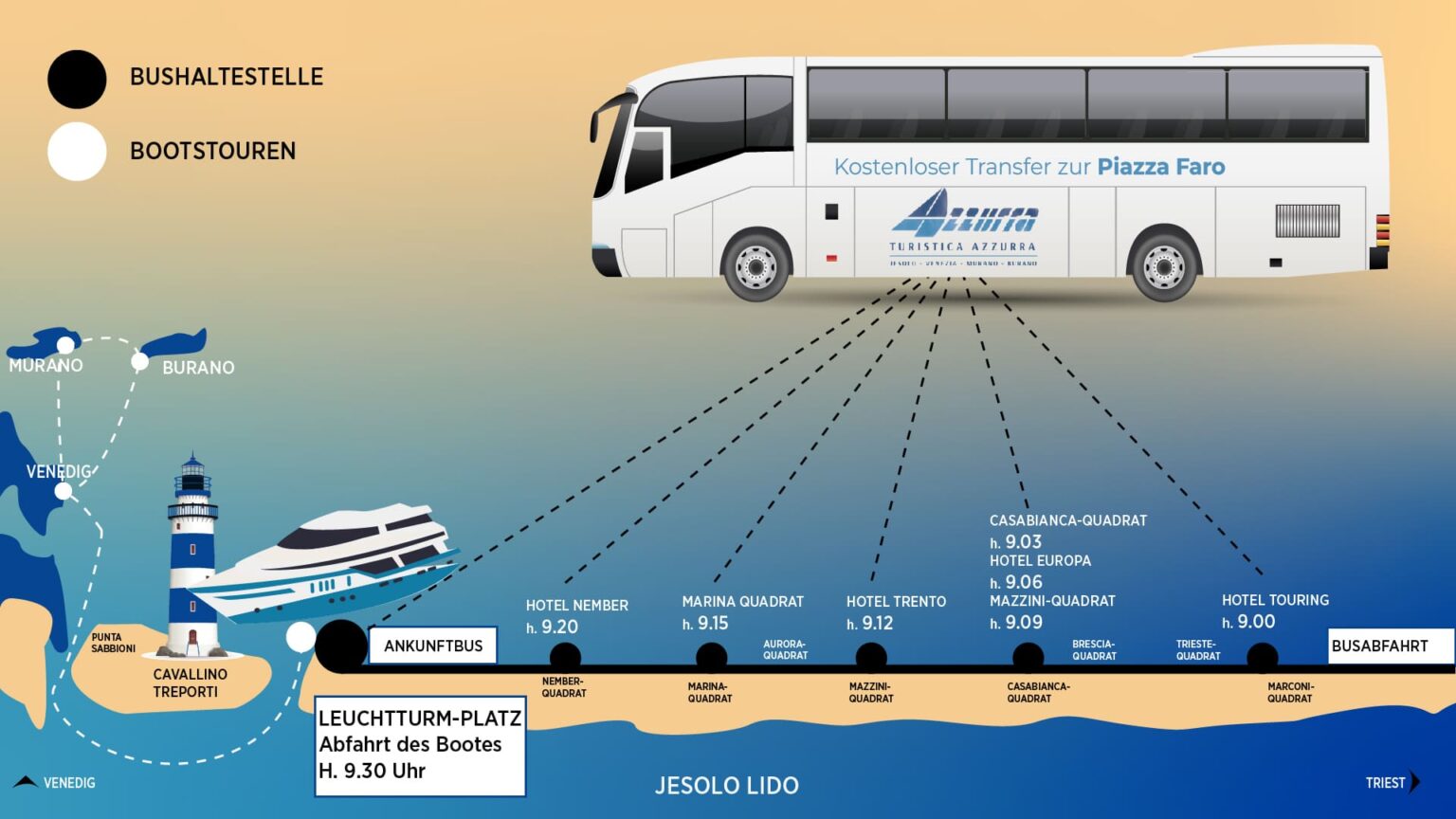 Kostenloser Shuttle-Bus  je nach Verfügbarkeit für diejenigen, die von Jesolo Lido zum Ausgangspunkt Piazzetta Faro Jesolo abfahren.